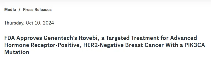 10月10日,FDA批准罗氏旗下基因泰克(Genentech)公司开发的口服小分子疗法Inavolisib (Itovebi)联合CDK4/6抑制剂palbociclib和氟维司群fulvestrant ,用于肿瘤携带PIK3CA突变、内分泌耐药、pik3ca突变、激素受体(HR)阳性、人表皮生长因子受体2 (HER2)阴性、局部晚期或转移性乳腺癌成年患者。