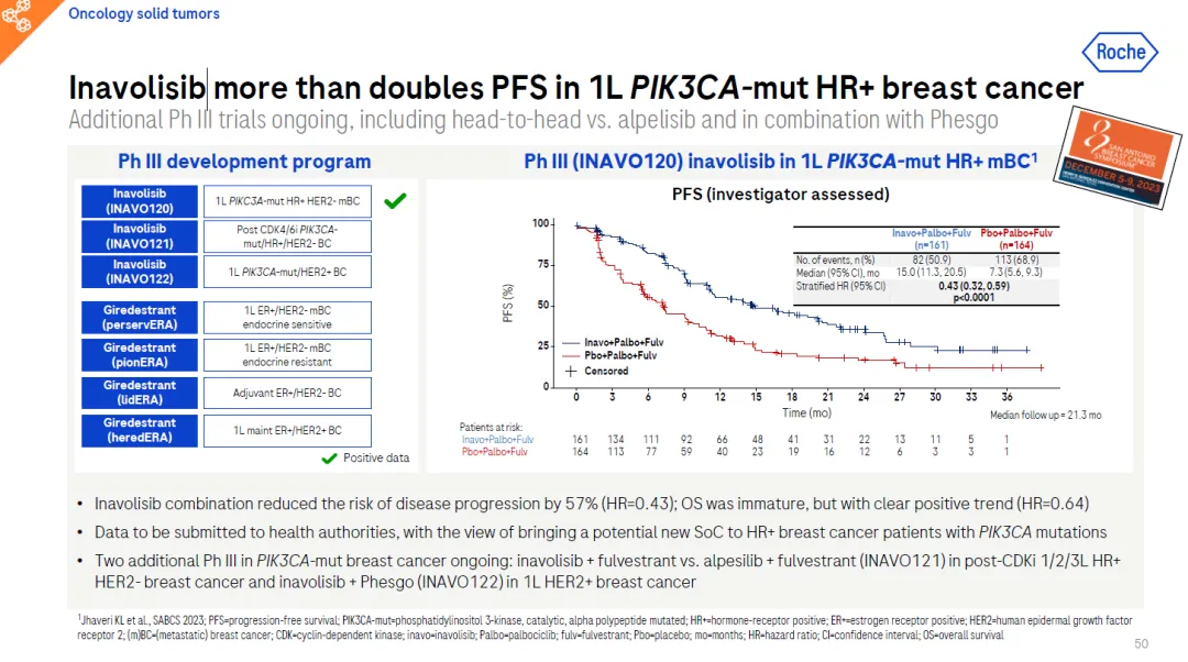 Itovebi是一款潜在“best-in-class”的PI3Kα抑制剂,此前曾获得美国FDA授予的突破性疗法认定。Inavolisib具有高度的体外PI3Kα抑制效力和选择性,能够特异性触发PI3Kα蛋白突变体的分解。通过这种独特的双重作用机制,inavolisib可能为HR阳性/HER2阴性、PIK3CA突变的晚期乳腺癌患者提供耐受良好、持久的疾病控制和潜在改善的结局。该批准基于关键的 III 期 INAVO120 研究的结果,主要疗效指标是根据RECIST 1.1版的研究者评估的无进展生存期(PFS)。其他疗效指标包括总生存期(OS)、研究者评估的客观缓解率(ORR)和缓解持续时间(DOR)。该研究显示,在一线治疗中,与单用palbociclib和氟维司群(fulvestrant)相比,基于Inavolisib的方案将疾病恶化或死亡风险降低了57%(15.0个月对7.3个月;HR=0.43,95% CI:0.32-0.59,p<0.0001),显示了具有统计学意义和临床意义的获益。