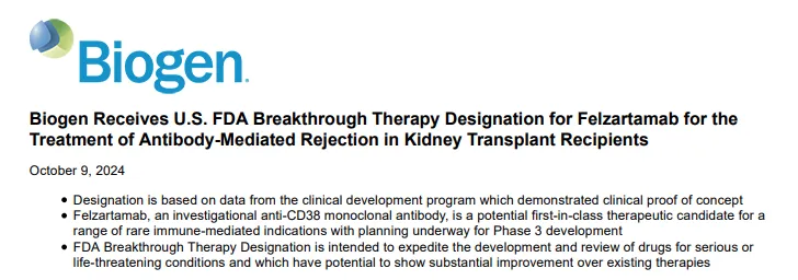 10月9日,渤健发布公告称,其在研抗CD38单克隆抗体Felzartamab已获得美国食品和药物管理局 (FDA) 的突破性疗法认定 (BTD),用于治疗肾移植患者的晚期抗体介导的排斥反应 (AMR),而无T细胞介导的排斥反应。此前该适应症已获得FDA的孤儿药认定(ODD)。