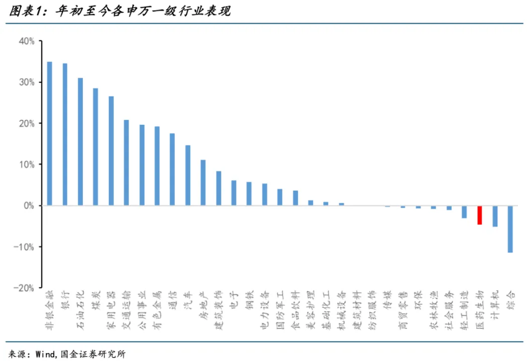 本轮行情启动之前,从2021年年中算起,中国医药行业股价已经经历了3-4年下行行情,估值和业绩预期压缩幅度巨大。根据WIND数据,年初至今,医药板块基本处于整个市场倒数第一。