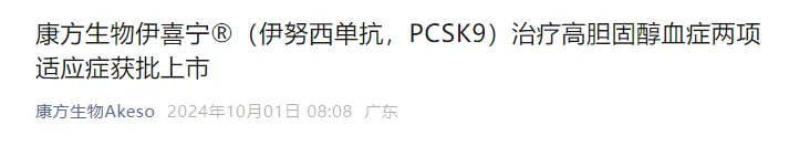10月1日,国家药品监督管理局批准了康方生物自主研发的1类新药伊努西单抗的上市许可申请,用于治疗原发性高胆固醇血症和混合型高脂血症,以及杂合子型家族性高胆固醇血症。