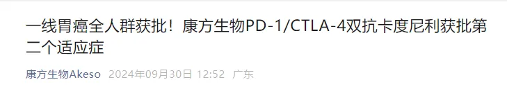 9月30日,康方生物PD-1/CTLA-4双抗卡度尼利获批第二个适应症:卡度尼利联合含氟尿嘧啶类和铂类药物化疗用于局部晚期不可切除或转移性胃或胃食管结合部(G/GEJ)腺癌患者的一线治疗。