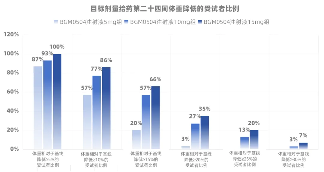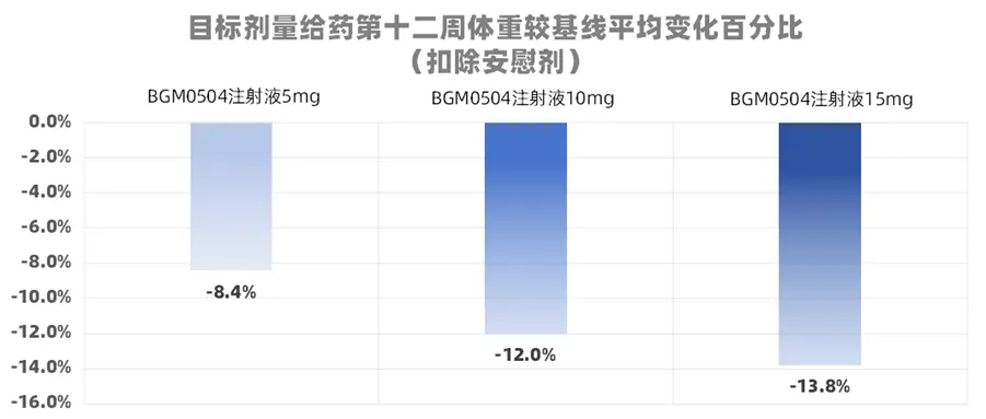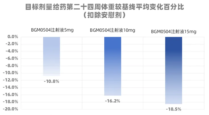 目标剂量给药24周,BGM0504的5mg组、10mg组、15mg组平均减重(扣除安慰剂)10.8%、16.2%和18.5%,各剂量组体重较基线降低≥5%的受试者比例分别为87%、93%和100%。