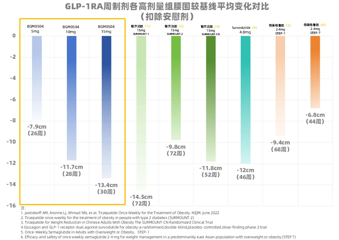 在相似基线情况下,BGM0504较短周期给药的减重效果和综合获益非但不逊色于GLP-1赛道双雄司美格鲁肽和替尔泊肽的长周期疗效,甚至在很多指标上有更好的表现。可以想象,如果进一步延长治疗周期,BGM0504或许能爆发更大的潜能。