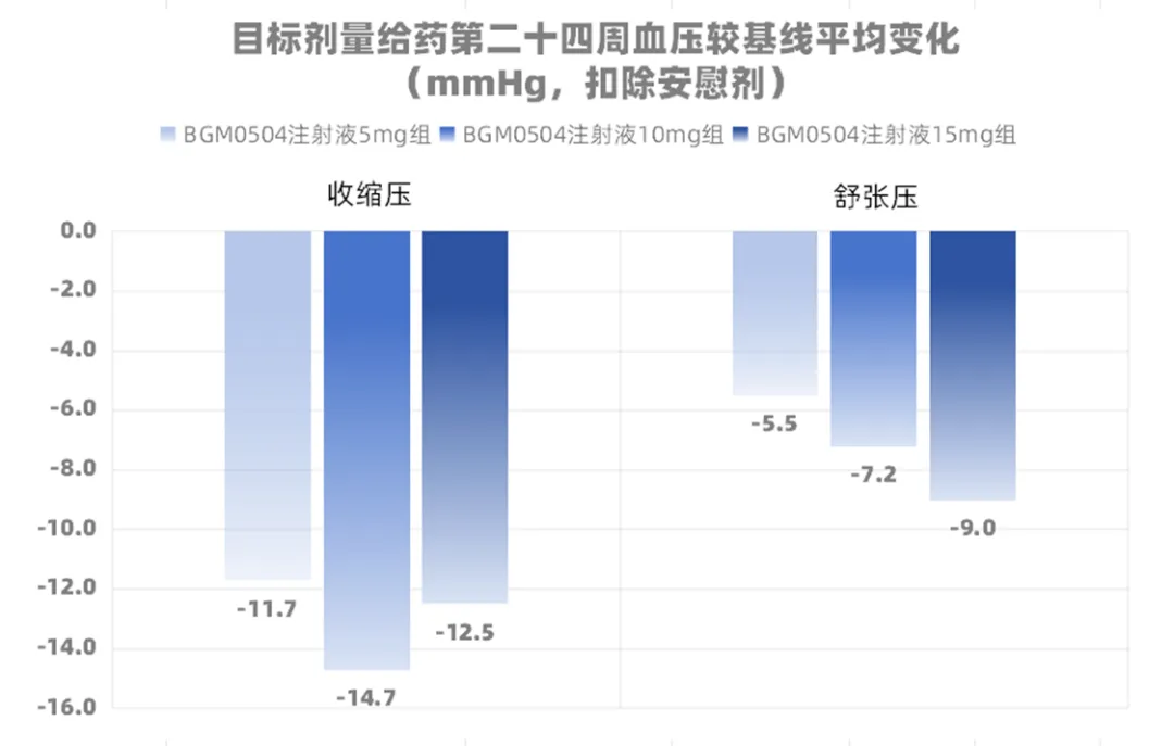 目标剂量给药第24周时,安慰剂组SBP/DBP降低不足1mmHg,而BGM0504试验组5mg组、10mg组和15mg组收缩压(SBP)降幅(扣除安慰剂)分别为11.7mmHg、14.7mmHg和12.5mmHg,舒张压(DBP)降幅(扣除安慰剂)分别为5.5mmHg、7.2mmHg和9.0mmHg。