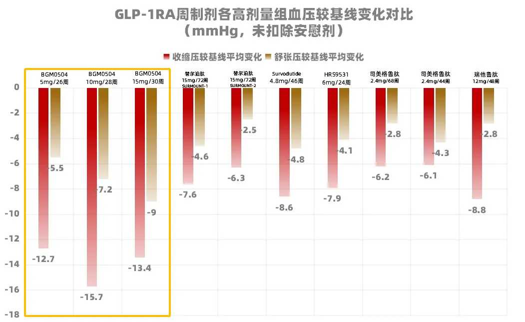 与同类GLP-1药物各最高剂量相比,BGM0504在相当及更低的治疗周期范围内初步表现出更好的降压优势。恒瑞医药的GLP-1R/GIPR双激动剂HRS9531在一项II期减重研究中显示,6.0mg给药24周时SBP下降7.5mmHg,DBP下降3.4mmHg。替尔泊肽在SURMOUNT-1减重研究中以15mg给药72周SBP下降6.4mmHg,DBP下降3.6mmHg。Survodutide 4.8mg的II期减重研究,给药46周SBP下降8.6mmHg,DBP下降4.8mmHg。司美格鲁肽在STEP-1减重研究中2.4mg给药68周SBP下降6.2mmHg,DBP下降2.8mmHg,而在以中国人群为主的STEP-7减重研究中2.4mg给药44周SBP下降6.1mmHg,DBP下降4.3mmHg。