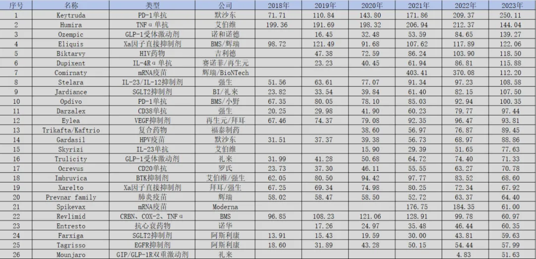 整个2023年中,全球共有26款药物销售额突破50亿美元。这些药物中既有抗癌爆款药物PD-1单抗、EGFR抑制剂,也有新冠疫苗、HPV疫苗,但有一点他们是相同的,那就是这些爆款药物几乎全部都出自MNC之手。