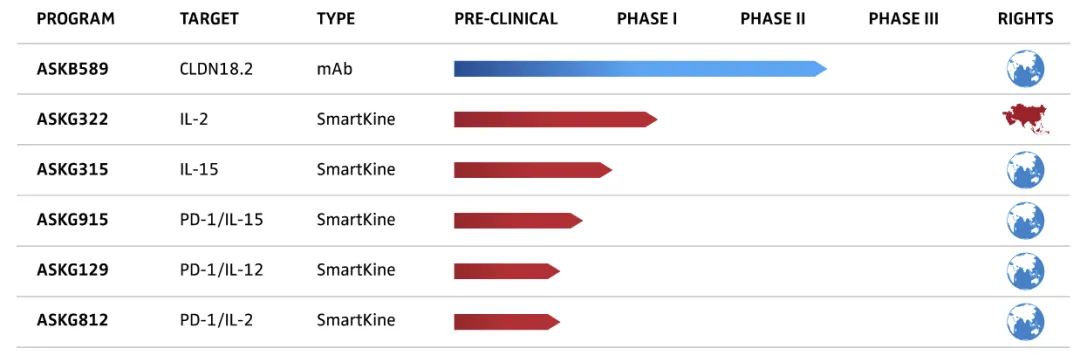 目前产品管线中有ASKB589 CLDN18.2(3期临床阶段);