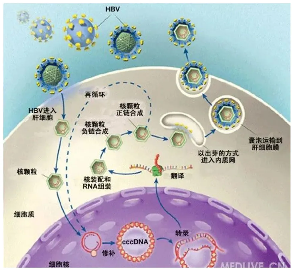 患者得乙肝,原因是感染了乙肝病毒——一种非常典型的DNA病毒。DNA病毒相比RNA病毒较好的地方在于它繁殖的方式是复制,而不是逆转录,发生突变的概率相对来说更小。但中间涉及过程依然复杂,但核心还是DNA病毒依靠宿主细胞的细胞核完成复制,依靠细胞质完成装配的过程:乙肝病毒进入细胞核后,负链DNA被修补成为环状双链DNA(cccDNA),DNA经过转录后成为mRNA,mRNA在此时会在HBV逆转录酶的作用下重新合成负链DNA,然后再复制另一条链,最后完成其病毒外壳的组装。