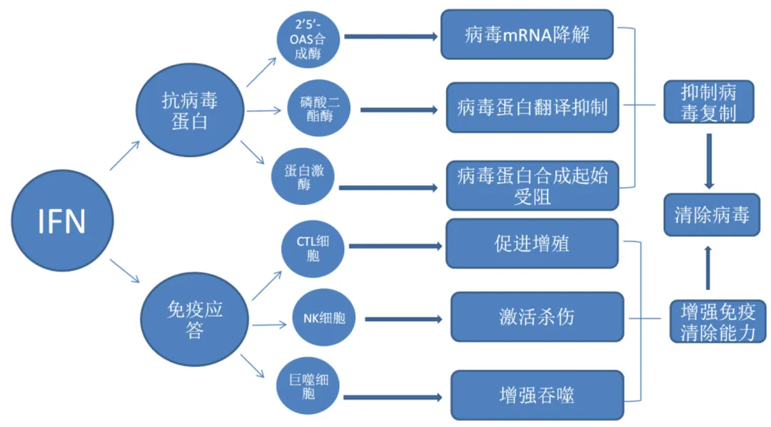 干扰素人体自身可以产生,用来抵御病毒侵袭。而当已经感染病毒时,进行外源注射可以快速提高体内干扰素水平,既可以起到增强免疫应答的效果,也可以起到对病毒自身转录,翻译等过程的抑制。