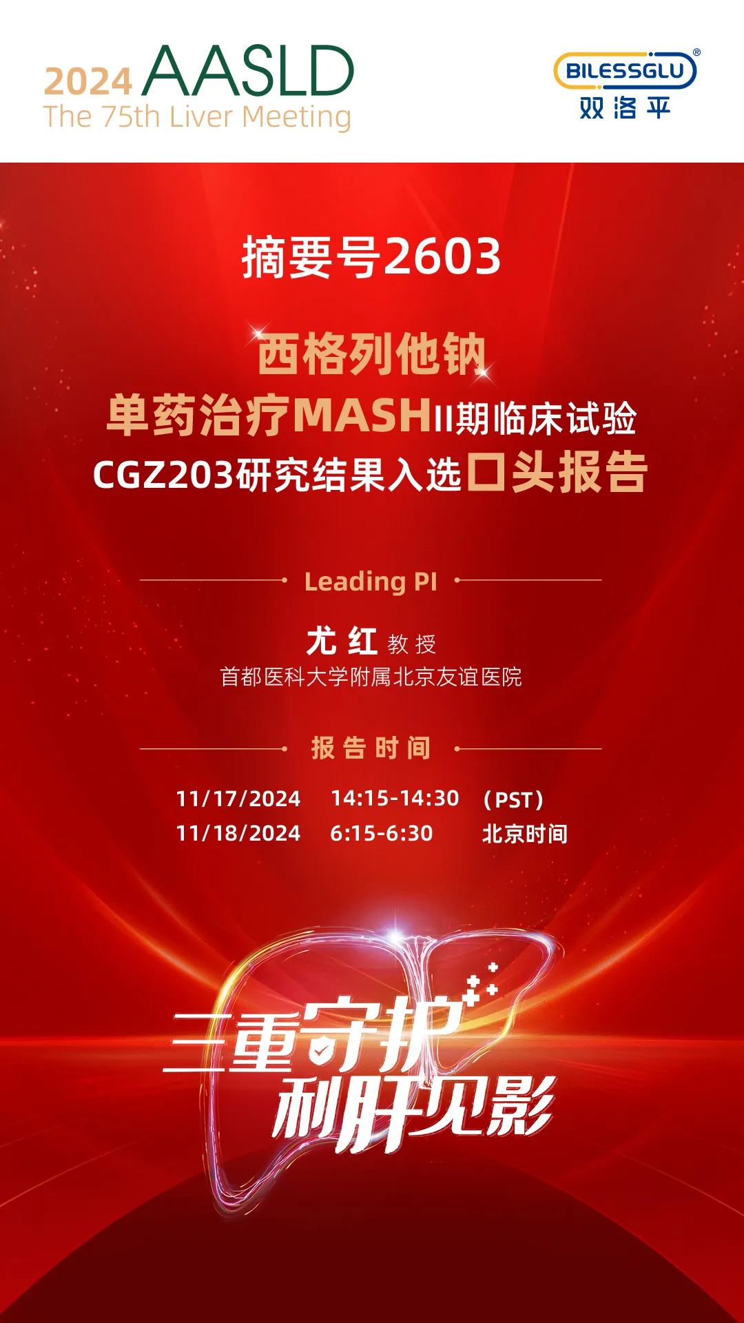 2024年10月15日,美国肝病研究学会年会(AASLD 2024)口头报告入选名单正式在线公布。我国自主研发的西格列他钠治疗非酒精性脂肪性肝炎(NASH)/代谢相关性脂肪性肝炎(MASH)II期临床研究(CGZ203试验)摘要入选,详细结果将在11月17日以口头报告形式公布。