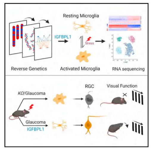 Dong Feng Chen教授此前发现治疗性给药IGFBPL1驱动促内稳态小胶质细胞,防止小鼠青光眼神经变性和视力丧失。(机制如下图所示)