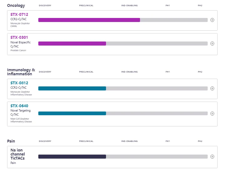 目前该公司具有癌症,自免,疼痛在内的五条管线,其中CCR2-CyTaC已经进入IND申请阶段。