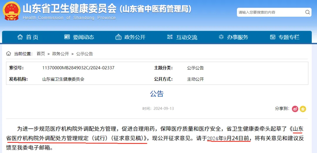 9月13日,山东省卫健委发出公告,对《山东省医疗机构院外调配处方管理规定(试行)(征求意见稿)》进行意见征求,征求时间截至2024年9月24日前。该规定解决了医院没有配备某个药物或者患者点名购买时的处方调配管理问题。