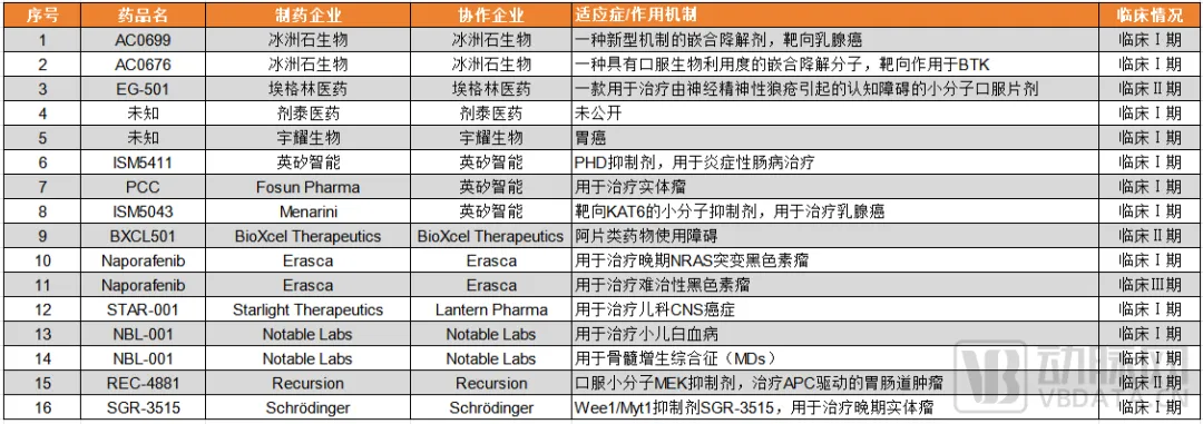 同时,上述企业新增16条管线/适应症,与停止或被撤下的管线数量持平。这些管线中,有近一半管线来自于中国持股的AI制药企业,英矽智能、埃格林医药、冰洲石生物、剂泰医药(晶泰科技持股)占据了其中的7席。