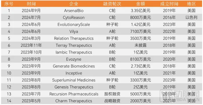 2023年—2024年8月英伟达投资的AI制药企业(资料来源:Pitchbook、Crunchbase、动脉橙产业智库)