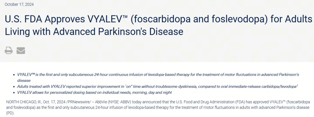 10月17日,艾伯维宣布,FDA已批准VYALEV(ABBV-951)作为首款也是唯一一款基于左旋多巴的24小时皮下连续输注疗法,用于治疗晚期帕金森病(PD)成人患者的运动波动。