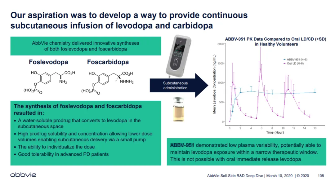 ABBV-951是左旋多巴和卡比多巴的前体药物,具有较高水溶性,可以通过一个连接到皮下的泵实现持续24小时皮下输注给药,从而使体内的左旋多巴和卡比多巴浓度在24h内保持稳定,改善晚期帕金森病患者的运动波动。