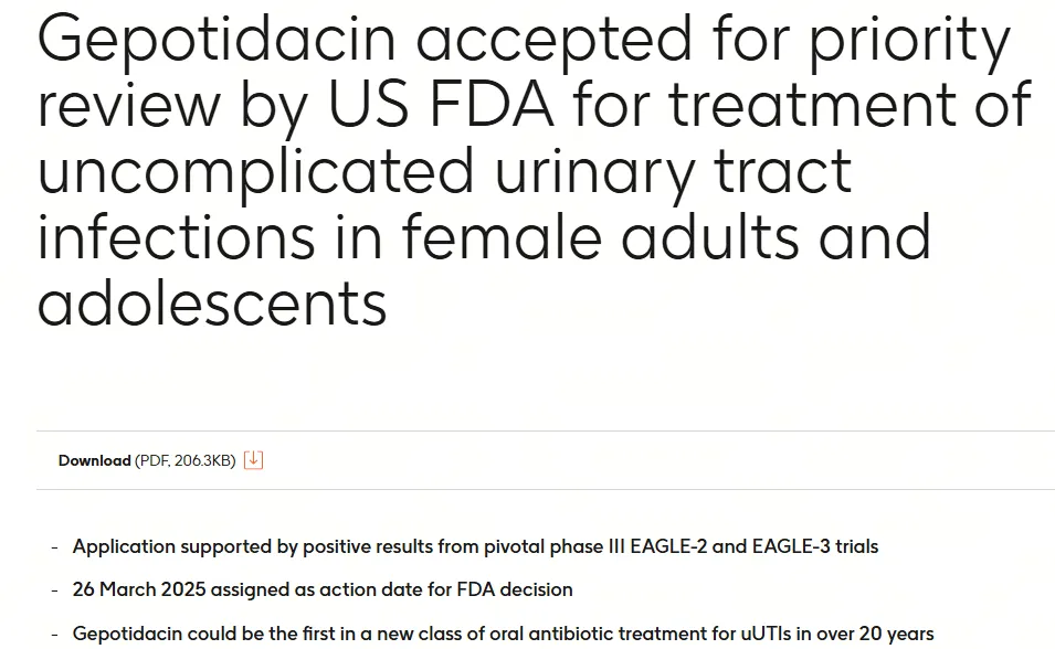 10月16日,GSK宣布美国FDA已受理Gepotidacin的新药上市申请(NDA)并授予其优先审评资格,用于治疗单纯性尿路感染(uUTI)的女性成人患者(≥40kg)和青少年患者(≥12岁,≥40kg),PDUFA日期为2025年3月26日。