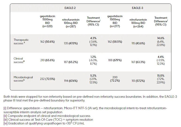 此次申请得到了两项关键性III期研究的阳性数据支持,即EAGLE-2和EAGLE-3研究。EAGLE-2和EAGLE-3研究均为全球性、随机、双盲、非劣效性(界限值为10%)III期临床研究,共纳入了3136例患者,旨在评估Gepotidacin(1500mg,每日2次)对比呋喃妥因(100mg,每日2次)治疗uUTI的有效性和安全性。研究的主要终点为第10~13天治愈检验期(TOC)访视时产生治疗应答(包括临床应答和微生物学应答)的患者数量。在EAGLE-2研究中,Gepotidacin组有50.6%的患者实现“治疗成功”,呋喃妥因组为47.0%。在EAGLE-3研究中,Gepotidacin组有58.5%的患者实现“治疗成功”,呋喃妥因组为43.6%。此外,在治疗失败风险更高的关键亚组中,Gepotidacin也表现出一致的非劣效于呋喃妥因的疗效,包括大肠杆菌病原体对其他抗生素耐药的患者、有复发史的患者和50岁以上的患者。