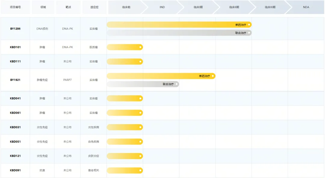 近日,百裕制药宣布与诺华就一款小分子抗肿瘤药物签订独家许可协议。根据协议,百裕制药将收到7000万美元首付款,以及可达11亿美元的开发、注册及商业化等各类里程碑付款和相应特许使用费。诺华将获得该款小分子创新药的全球独家开发及商业化权利。目前,百裕制药管线中共10款在研药物,其中3款已披露靶点,即BY1298、KBD101和BY1921。BY1298和KBD101均为靶向DNA依赖性蛋白激酶(DNA-PK)的小分子抑制剂,而BY1921是一款聚ADP核糖聚合酶7(PARP7)抑制剂。其中,BY1298进展最快,正在实体瘤患者中开展单药治疗和联合治疗的II期临床。