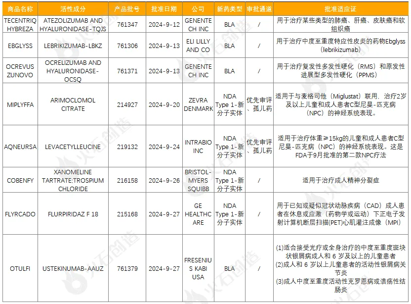 截至2024年10月22日FDA官网披露,2024年9月FDA共完成67项药品首次批准(不包含暂时批准),其中NDA/BLA批准9款(不包含暂时批准),包括4款新获批的新分子实体药物(NDA:Type 1 - New Molecular Entity),4款生物制品药物(BLA)。