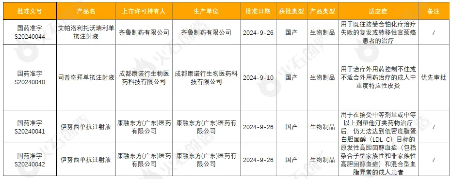 截至2024年10月22日NMPA披露,2024年9月共批准国产首次注册药品250件。本月有4个品规1类创新药获批,为生物制品。