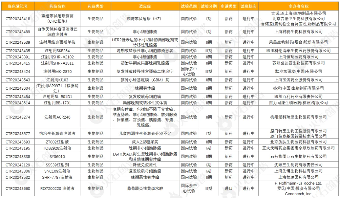 表5 2024年9月创新药临床试验(以部分生物制品为例)