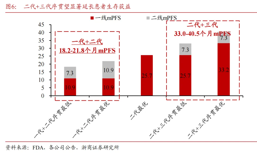 目前较为常见的序贯方案为一线治疗使用二代ALK-TKI阿来替尼(mPFS= 25.7个月)或恩沙替尼(mPFS=33.2 个月),再结合三代ALK-TKI劳拉替尼(mPFS=7.3 个月),合计mPFS在33-40.5个月。