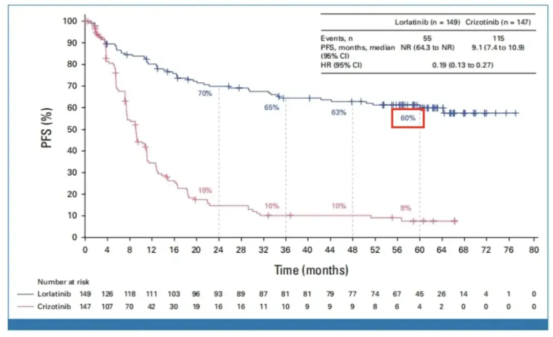 CROWN研究的5年随访数据显示,劳拉替尼组的五5年PFS为60%,而克唑替尼组为8%;劳拉替尼组的mPFS再创新高突破60个月,成为目前首个且唯一mPFS突破5年的 ALK-TKI,同时也是目前靶向药在晚期 NSCLC领域取得的最长生存数据。