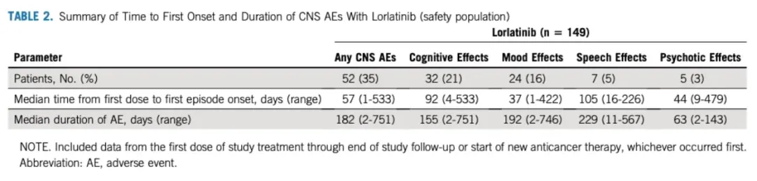 劳拉替尼最具争议的副作用在于CNS部分,在CROWN研究中有35%患者出现CNS AEs(可能导致导致永久性治疗中断),尽管大部分患者都不需要干预(调整剂量)便能恢复,但仍有38%发生CNS AEs的患者在分析时未能解决。