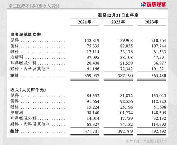 正因此,卓正医疗的收入主要来自门诊服务,而非住院。从收入结构来看,儿科、齿科、眼科是其收入主力,2023年分别为其创收1.33亿元、1.13亿元和1.48亿元,占比分别为22.5%、19%和25%。