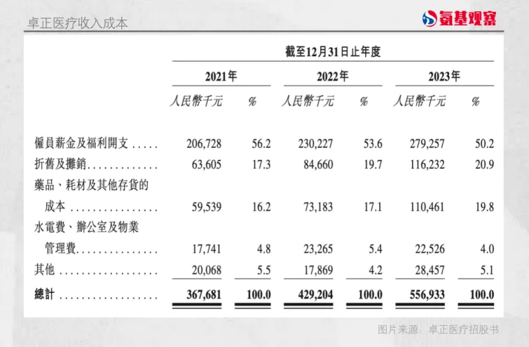 在卓正的各项成本、开支之中,僱员薪金及福利开支位列第一,2021年至2023年分别为3.13亿元、3.79亿元和4.36亿元,占同期总收入的75.2%、80.2%及63.2%。