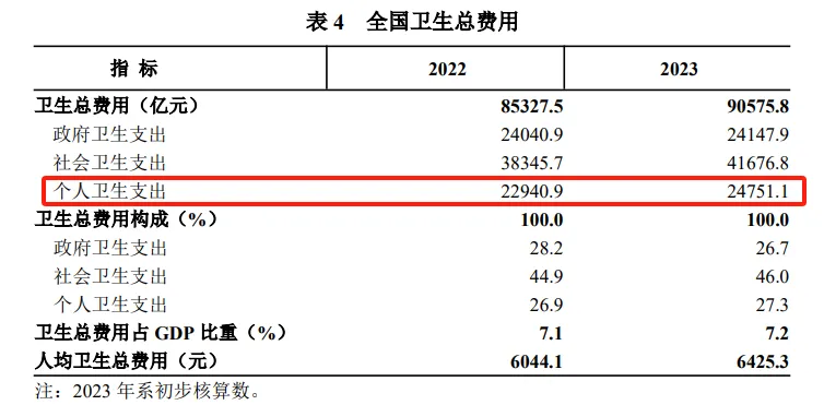 尽管我国医药产业这些年持续发展,但在很多细分领域却依然依赖于MNC。在前段时间披露的《2023年我国卫生健康事业发展统计公报》中,我国2023年卫生总费用为9.06万亿元,占全国总GDP的7.2%。其中,个人卫生支出达2.48万亿元,占总卫生费用的27.3%。或许大家对于这样一个数据并没有太多认知,但如果我们进一步细化,就会发现其中的问题。