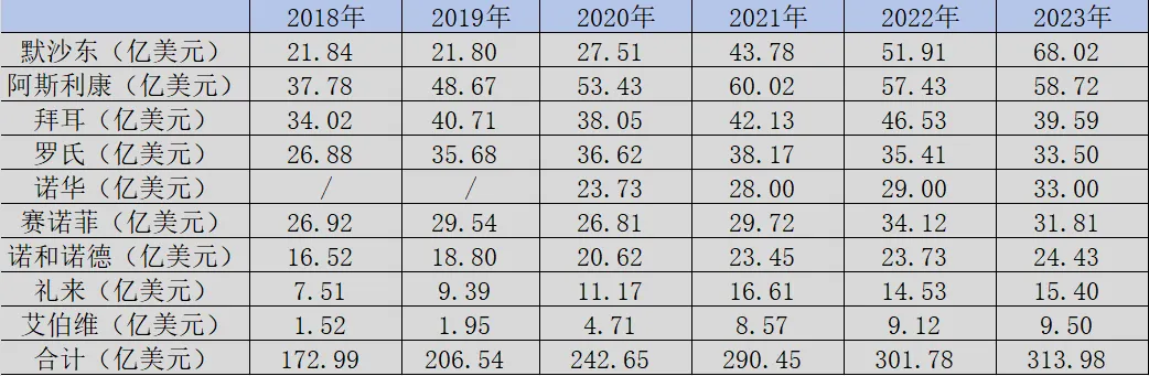 经过系统复盘,所有以制药为主业的MNC中,共有9家公司披露了中国区的营收数据,分别是:默沙东、阿斯利康、拜耳、罗氏、诺华、赛诺菲、诺和诺德、礼来、艾伯维。(营收全部统一为美元口径)