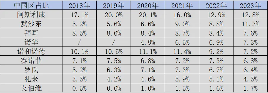 从企业营收全局分析,阿斯利康、默沙东中国区营收占比较高,均突破了10%;拜耳、诺华、诺和诺德、赛诺菲、罗氏占比均在6%~7%之间,而礼来、艾伯维占比较低,分别为4.5%和1.7%。