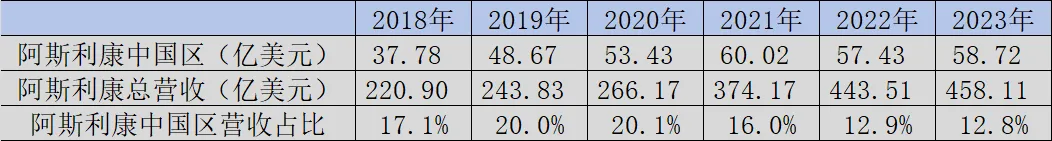 不过,从2021年开始,阿斯利康中国区营收逐渐开始进入瓶颈期,不仅营收总量停滞不前,而且在公司总营收中的占比更是持续下降至12.8%。