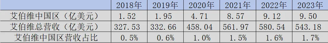 过往6年艾伯维中国区业务表现亮眼,在2018年时中国区业务营收仅为1.52亿美元,而到了2023年已经增长到9.5亿美元。