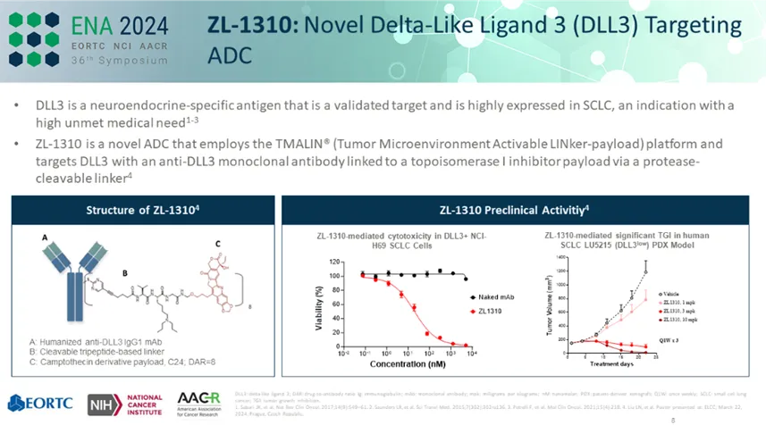 自2017年Rova-T宣告退场至今,全球仅有3款DLL3 ADC进入临床阶段,开发难度可想而知。此次露面的ZL-1310是目前全球进度最快的DLL3 ADC,其数据成色如何也备受关注。