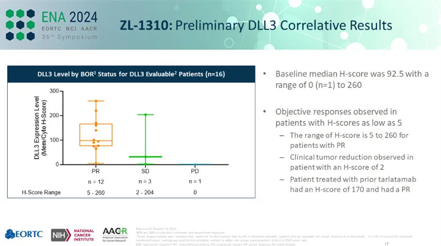 值得注意的是,DLL3 H-Score评分大于5(范围:5-260)的患者均实现了缓解,换言之,DLL3过表达的患者,ORR达到了100%。