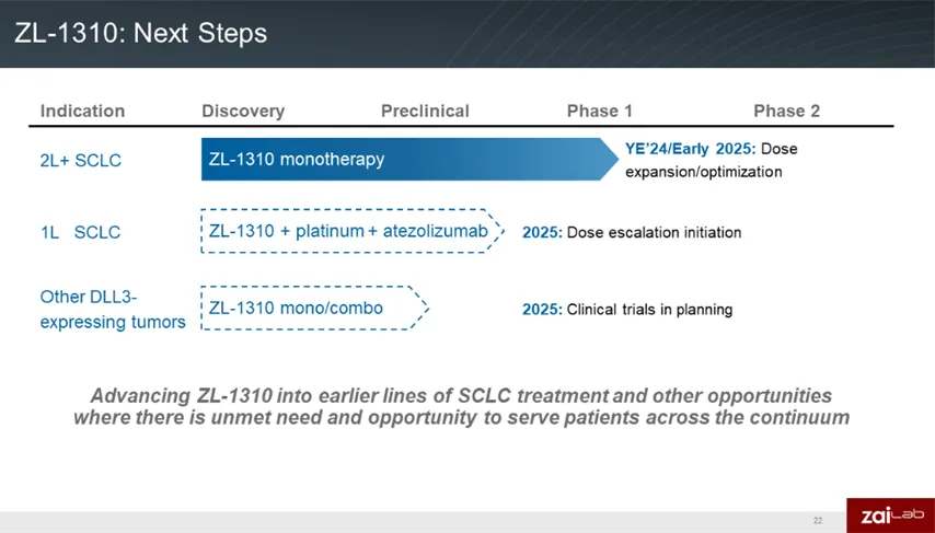 此前上市的tarlatamab为二线治疗,不过安进已开展多项临床进一步分别评估tarlatamab作为LS-SCLC的放化疗后巩固治疗、ES-SCLC的一线后维持治疗和二线治疗的潜力。鉴于ZL-1310在Ia期研究中有着非常不错的疗效,并且可控的安全性也提供了探索联合治疗的空间,未来ZL-1310也有希望在前线治疗中验证更广泛的适用性。再鼎医药已计划在2025年开展ZL-1310联合阿替利珠单抗和化疗一线治疗SCLC的剂量递增研究。