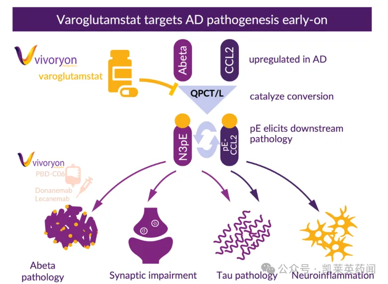 由于QPCT可催化具有神经毒性的N3pE淀粉样蛋白生成,N3pE与AD患者大脑中聚合成斑块的β淀粉样多肽有关,也会对AD其他病理因素产生不良影响。因此,包括Vivoryon等公司最早企图通过抑制QPCT来阻止N3pE淀粉样蛋白的形成,具有预防神经元损伤的潜力。