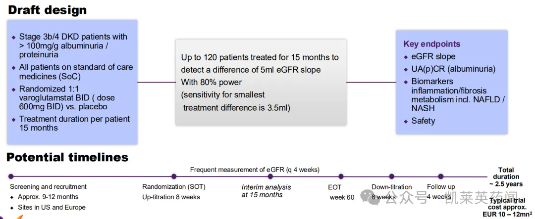 尽管 VIVIAD 中的患者是根据 AD 状态而非肾功能水平进行选择的,但其中许多人由于年龄和/或合并症而导致肾功能下降,分析显示varoglutamstat 对关键肾功能终点 (eGFR)的改善具有统计学意义,且促炎细胞因子 pE-CCL2 显著降低;促使公司计划针对3b/4 期 DKD 患者进行安慰剂对照的 2 期研究。