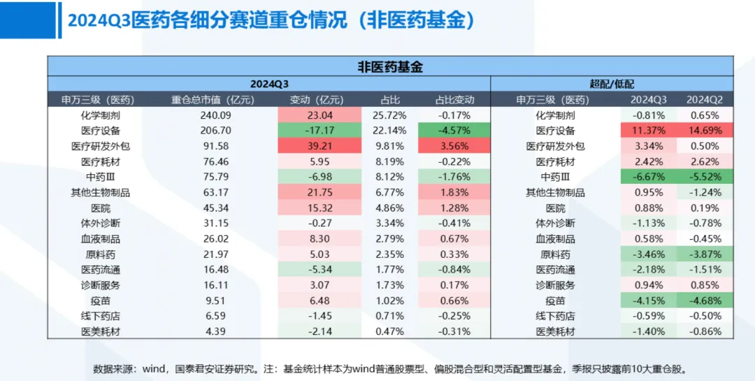 据海通医药统计,相比2024Q2,2024Q3公募基金医疗研发外包板块的重仓持股市值增加了约150亿元,仅次于化学制剂的170亿元。