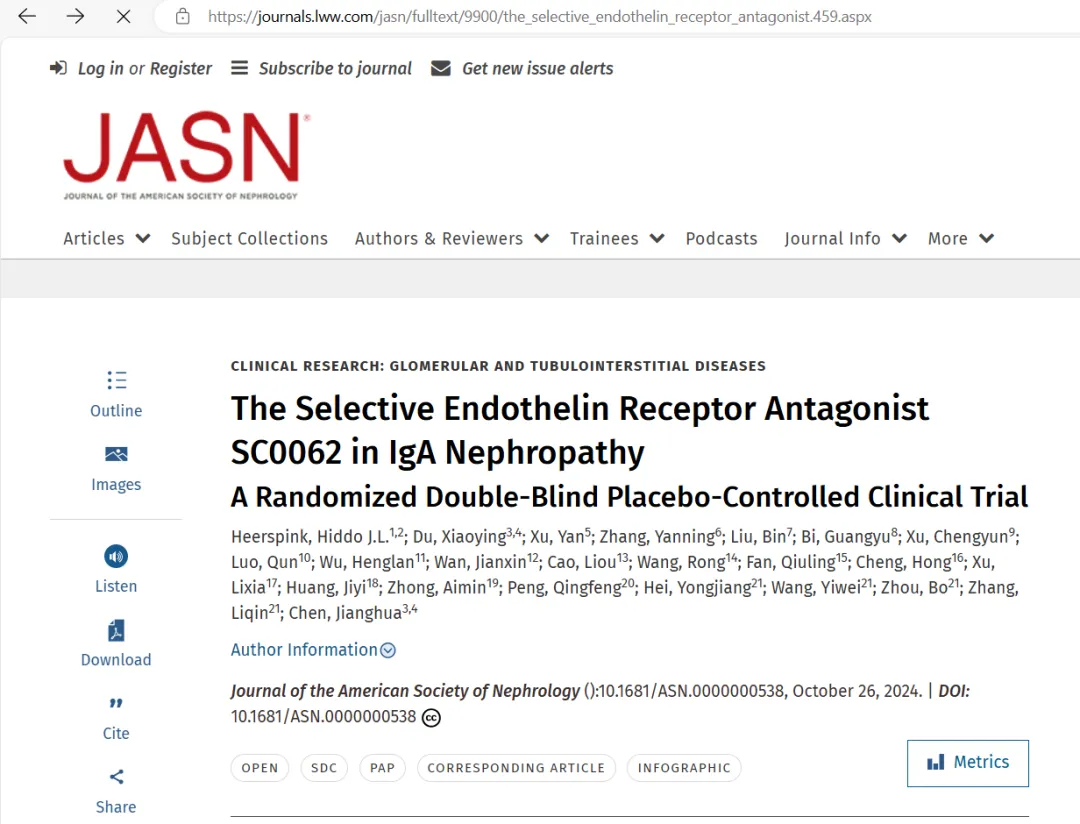 该项研究结果已同步在ASN旗下世界领先的肾脏病学杂志JASN(Journal of the American Society of Nephrology,美国肾脏病学会杂志)上发表。