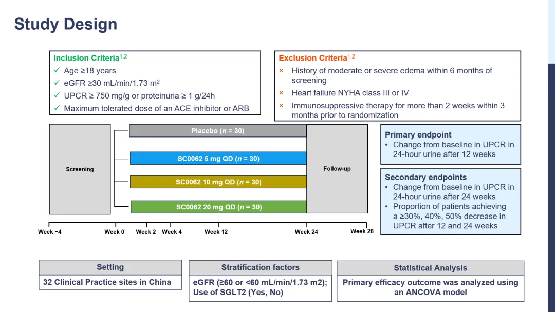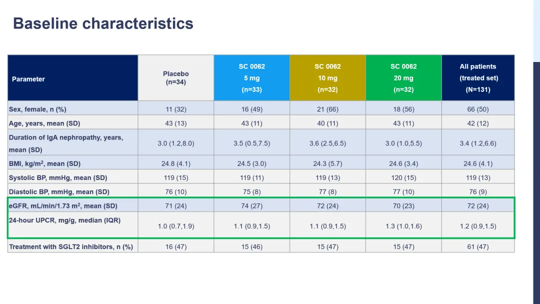 该研究中女性患者占50%(66人),平均年龄为42岁。在接受安慰剂组及5mg、10mg、20mg剂量SC0062的患者的平均eGFR(mL/min/1.73m2)基线为71、74、72以及70;24小时UPCR(mg/g)的中位值为1.0(0.7,1.9)、1.1(0.9,1.5)、1.1(0.9,1.5)、1.3(1.0,1.6);接受SGLT2抑制剂作为背景治疗的患者在四组中的比例为46~47%。