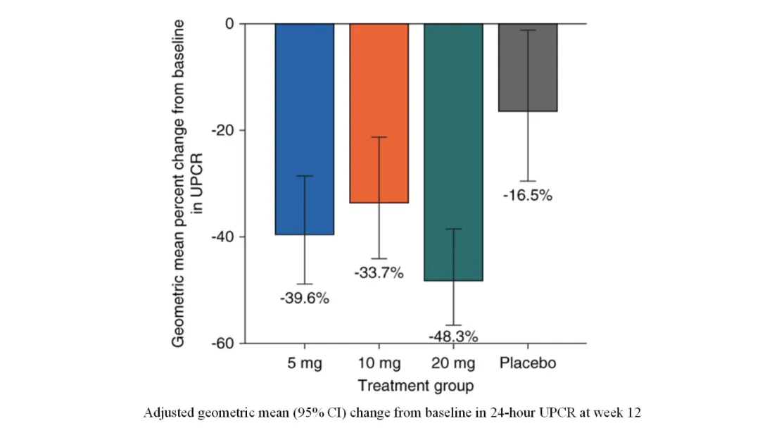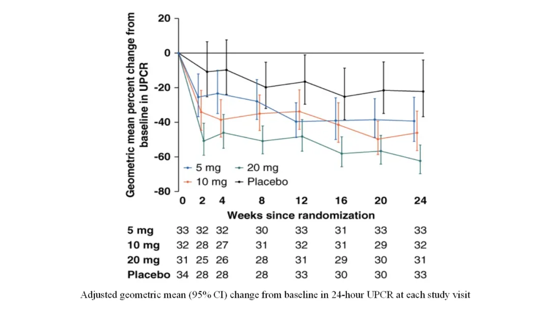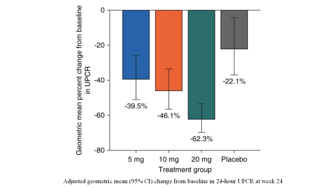 次要终点2:与基线相比,在第24周时,接受5mg、10mg、20mg剂量的SC0062及安慰剂的患者24小时尿蛋白/肌酐比值(UPCR)的几何平均比值降幅分别为39.5%、46.1%、62.3%和22.1%;