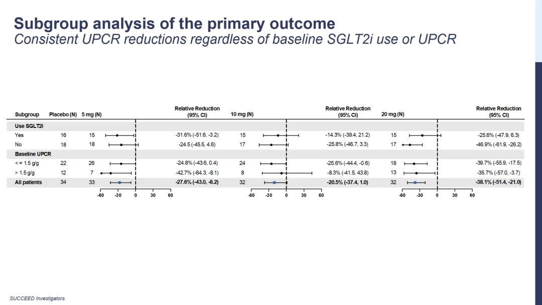 SC0062在2-SUCCEED研究的IgA肾病人群队列中达到主要终点:与基线相比,在第12周时,接受5mg、10mg、20mg剂量的SC0062及安慰剂的患者24小时尿蛋白/肌酐比值(UPCR)的几何平均比值降幅分别为39.2%、33.7%、48.3%和16.5%;
