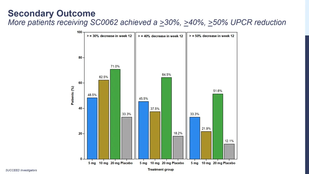 次要终点1:与基线相比,在第12周时,接受5mg、10mg、20mg剂量的SC0062及安慰剂组患者UPCR降低超过30%的比例为48.5%、62.5%、71.0%以及33.3%;超过40%的比例为45.5%、37.5%、64.5%以及18.2%;超过50%的比例为33.3%、21.9%、51.6%以及12.1%;