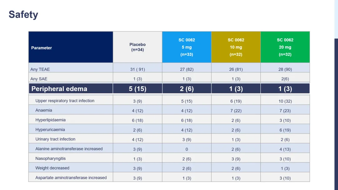 安全性:SC0062具有良好的安全性与耐受性,与安慰剂相比不增加体液潴留的风险,安慰剂组、5mg、10mg、20mg组发生水肿人数与比例为5(15%)、2(6%)、1(3%)、1(3%)。此外,SC0062不增加体重或 NT-pro-BNP。